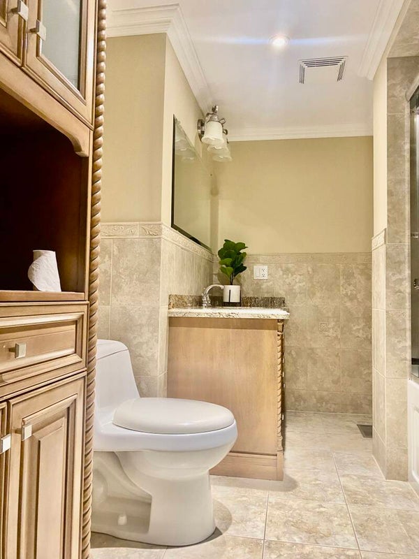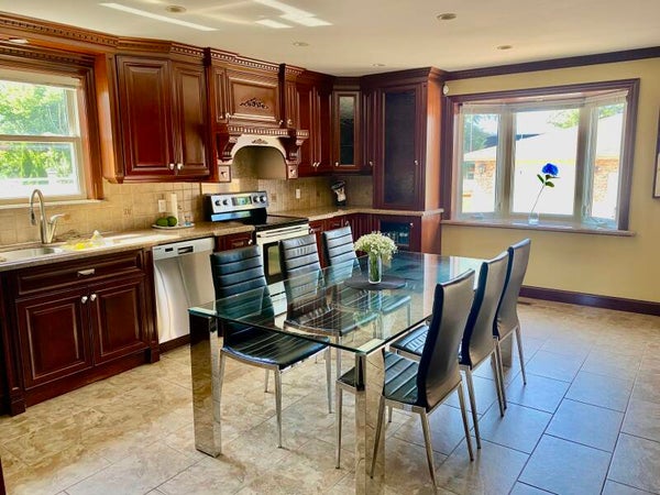Mainflood good size bedroom with queen bed, night stand, lamp and large window with garden view.